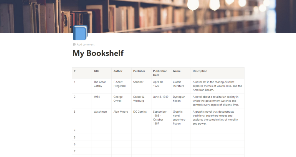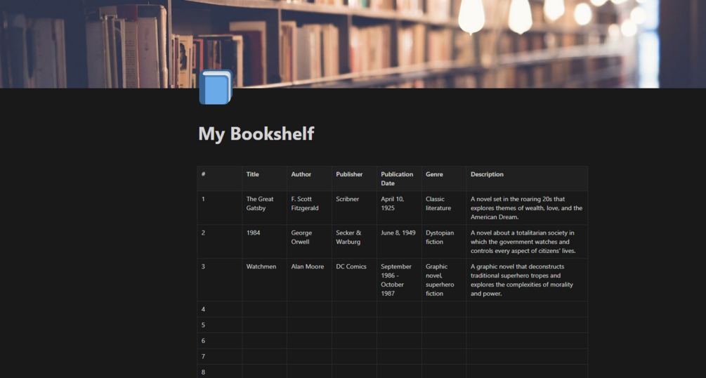 Template GalleryYou'll get The Bookshelf Manager template for Notion, designed to help you record all of your books, comics, etc